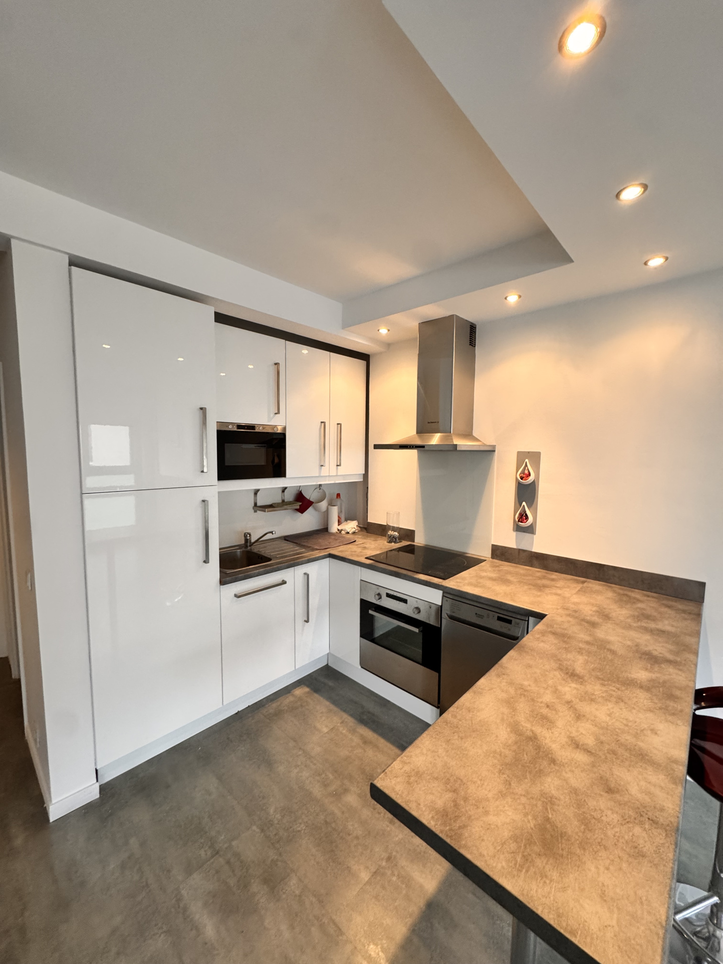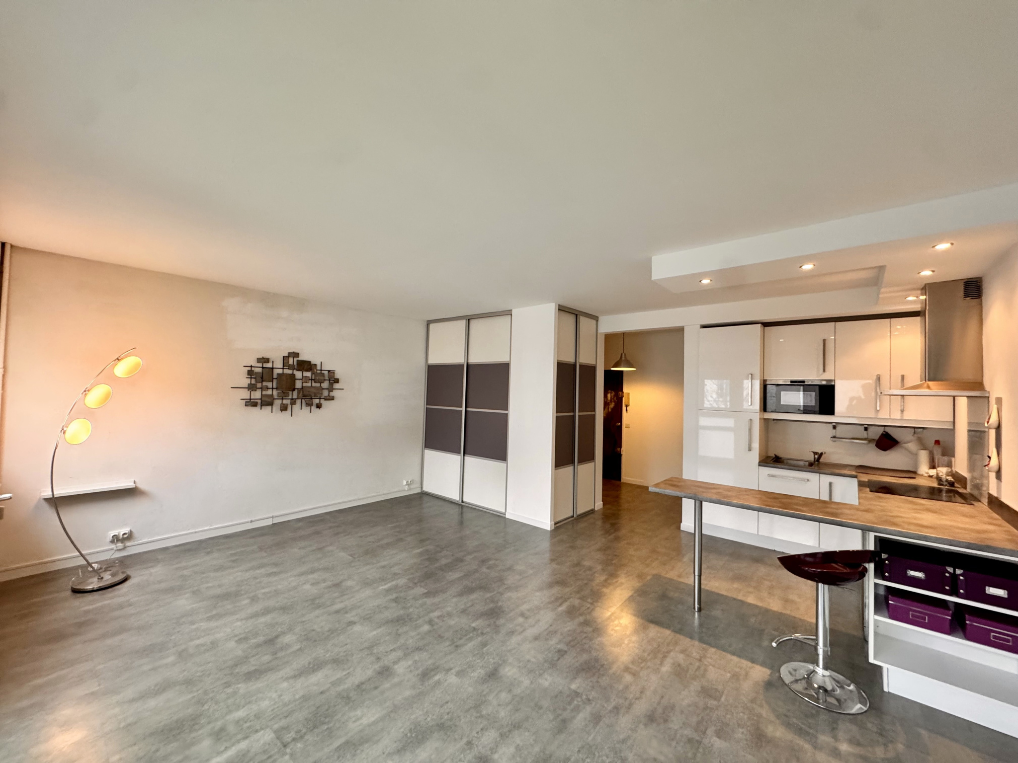 Entrée avec placard, cuisine américaine équipée s'ouvrant sur une grande pièce de vie de 29 m², salle d'eau avec wc. L'ensemble refait entièrement.